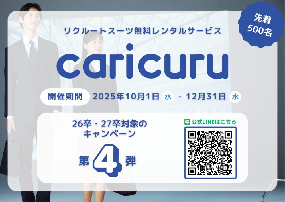 リクルートスーツ無料レンタルサービス「caricuru(カリクル)」にて、2026年卒・2027年卒と対象とするキャンペーン第4弾を2025年10月1日(水)より開始いたしました。